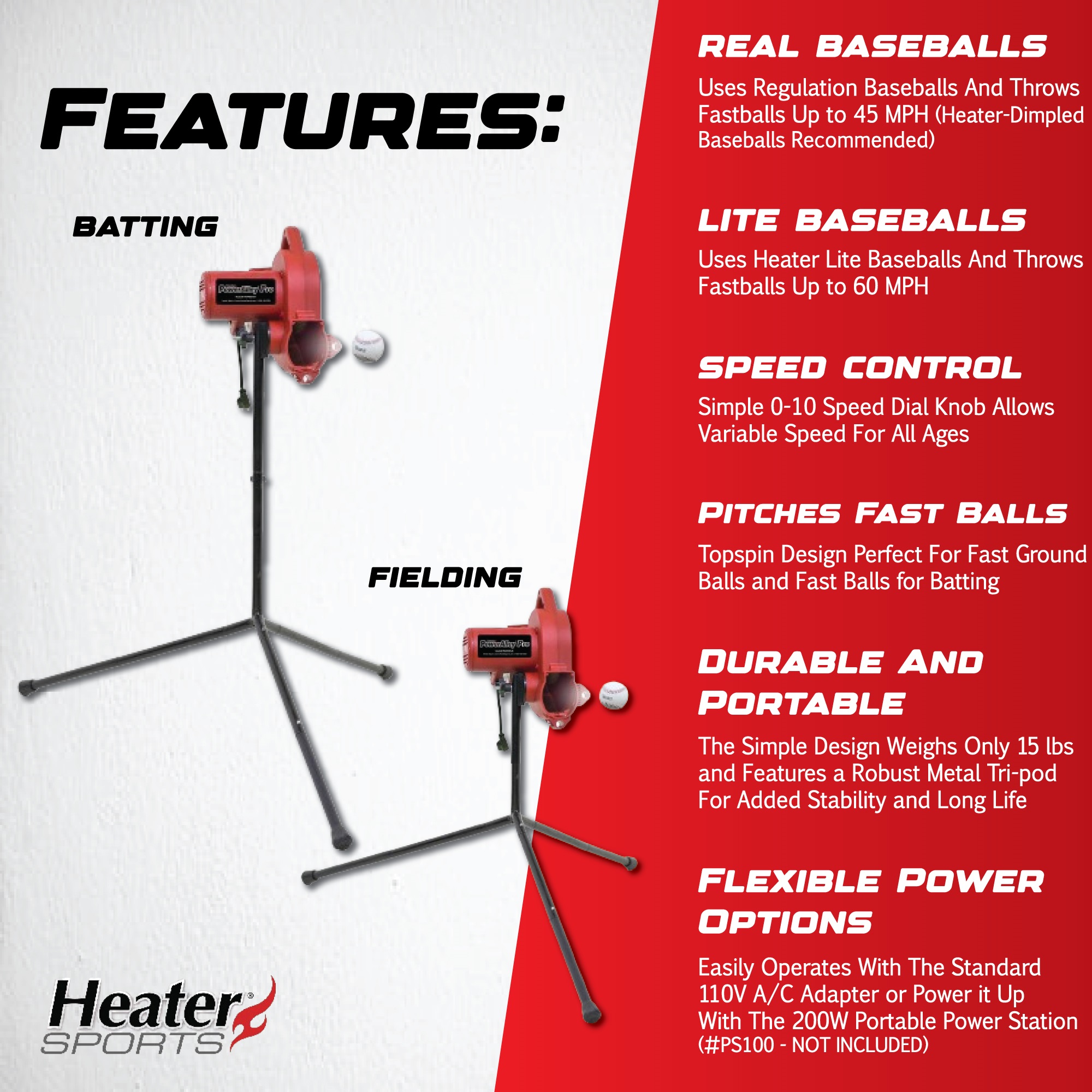 The PowerAlley Pro pitches lite-balls up to 60 MPH, and real baseballs up to 45 MPH